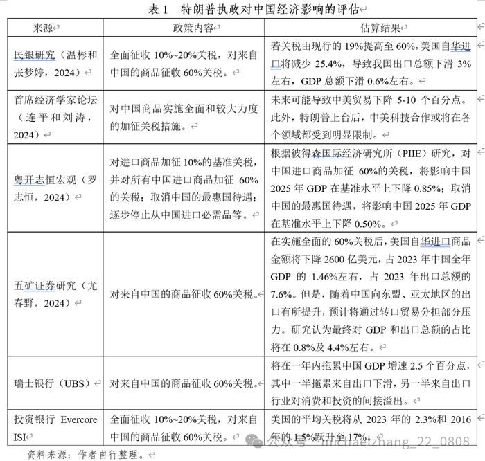 目前,一些研究机构和专家对特朗普可能实施的对华加征高关税政策的影响进行了深入分析和估算(见表1)。从估算结果来看,若这些高关税政策落地,将对中国的出口、经济增长以及中美贸易关系等方面产生重大负向冲击。出口方面,预计美国自华进口将大幅减少,中国出口总额将出现不同程度的下滑。经济增长方面,也将面临一定程度的下降压力,从下降0.25~2.5个百分点不等。此外,中美贸易可能下降5~10个百分点。