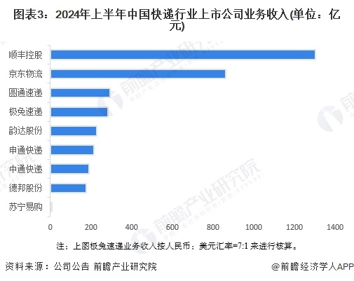 上市公司方面,按快递相关业务收入来看,2024年上半年,顺丰控股以1302.08亿元的业务收入位列第一,远高于其他公司;京东物流快递业务收入为863.45亿元,位列第二。