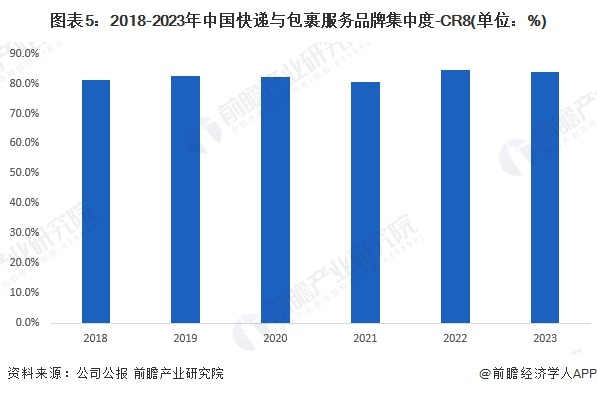 根据《邮政行业发展统计公报》公布的数据,2018-2023年,中国快递服务行业市场集中度-CR8整体呈波动上升趋势。2023年,快递与包裹服务品牌集中度-CR8为84.0%,较2022年下降了0.5个百分点,较2018年上升2.8个百分点。