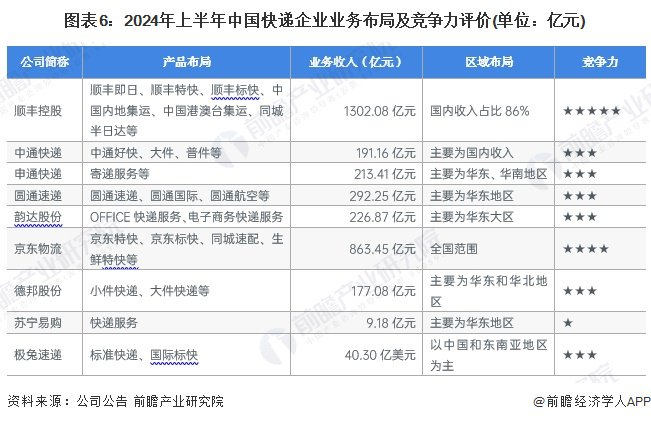 结合代表企业快递业务发展概况,及企业业务收入、区域布局等指标对其竞争力进行评价如下: