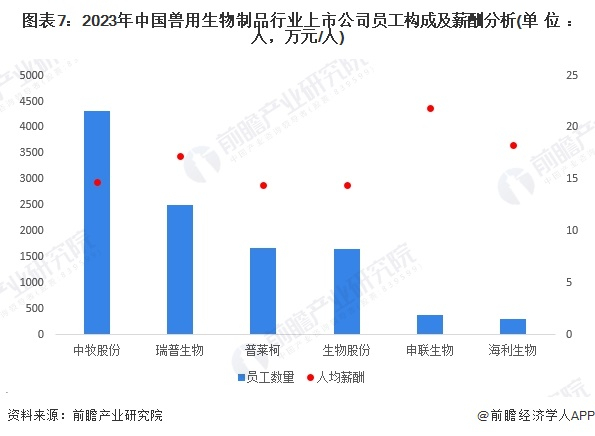 从兽用生物制品行业上市企业已有的公开信息分析,员工总数最多的企业是中牧股份,员工总数为4326人;其次是瑞普生物,员工总数2496人。人均薪酬水平最高的企业是申联生物,人年均薪酬达21.89万元,其次是海利生物,人年均薪酬达18.27万元。