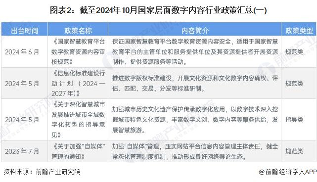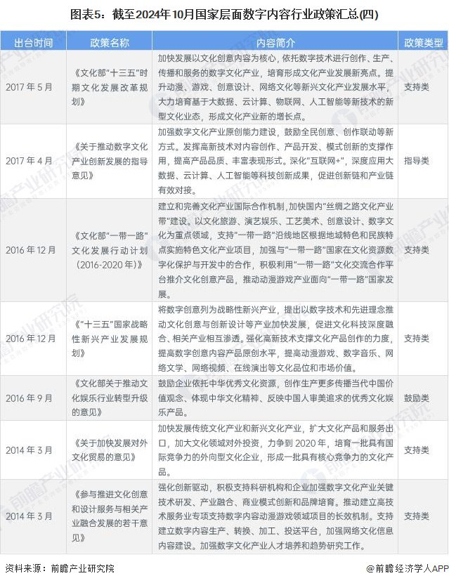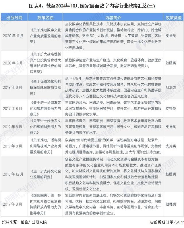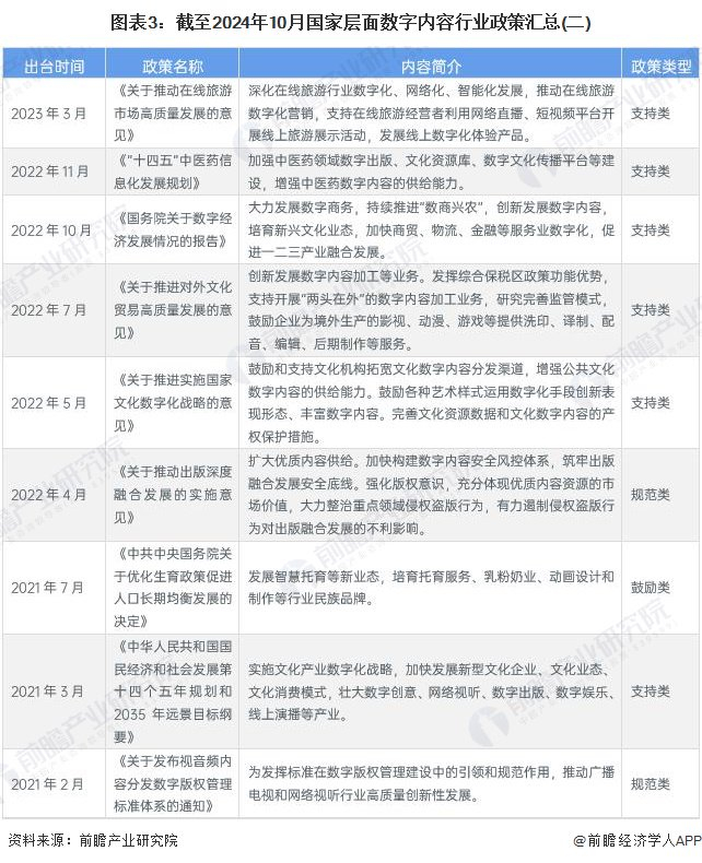 我国政府陆续出台了多项政策以推动数字内容行业的健康发展,国家层面发展政策及规划主要致力于通过技术支持、内容创新、版权保护等方式促进数字文化产业的发展。截至目前,中国数字内容产业相关政策汇总如下: