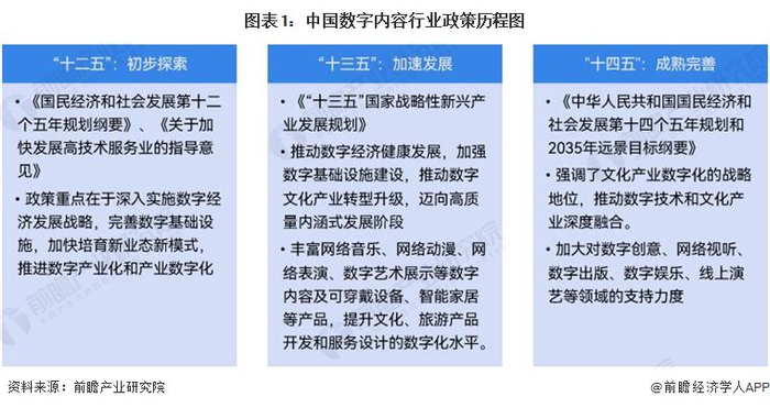 “十二五”时期以来,我国数字内容领域政策逐步深化,不断加强数字内容产业基础设施建设、完善市场监管、推动数字内容产业创新发展。现阶段数字内容行业政策逐步成熟完善,政策聚焦实施文化产业数字化战略,政策导向更加注重高质量发展,强调优质内容的创作,同时也加强了对数据版权保护、数据安全的关注。