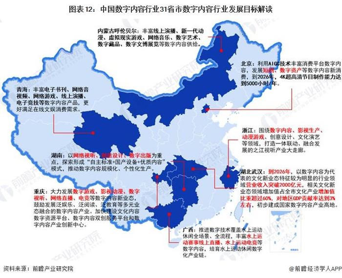 各省市针对数字内容行业发展规划重点聚焦利用5G、人工智能、元宇宙、虚拟现实等前沿技术,提升数字内容创作与传播能力,促进数字文旅、数字贸易、数字创意等新兴业态的成长;此外,各地还注重数字版权保护、数字内容的国际推广与交流合作,力求打造具有地方特色与全球竞争力的数字内容产业生态。各省市数字内容产业发展目标具体如下: