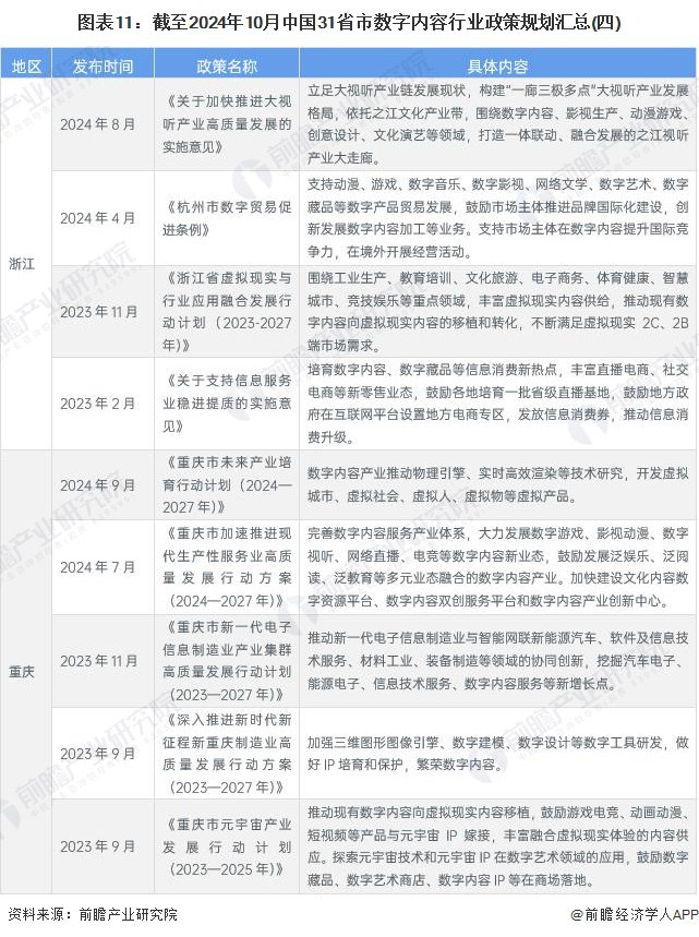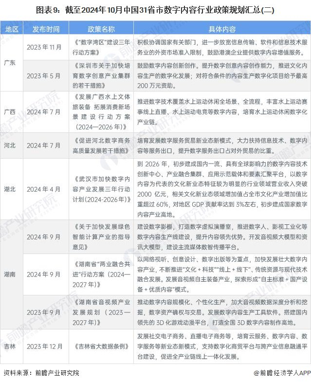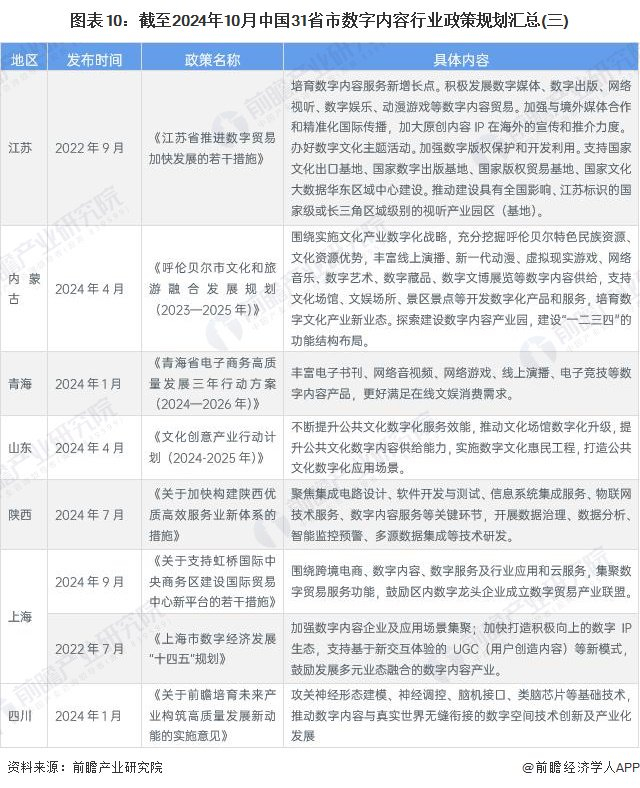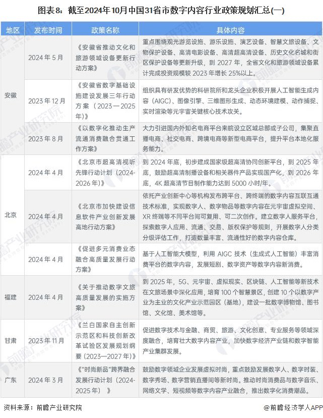 地方层面政府针对数字内容产业的发展,发布了相关政策与规划,推动产业升级与融合创新;政策涵盖从设备更新、数字基础设施建设、数字内容创新创作到数字贸易服务等多个方面。各省市数字内容行业政策规划汇总如下: