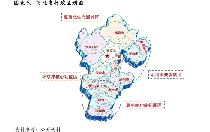 河北省下辖石家庄、唐山、保定、邯郸、张家口、承德、廊坊、秦皇岛、沧州、邢台和衡水等11个地级市。近年河北省按照“一核、双城、三轴、四区、多节点”京津冀空间发展格局,着力打造以保定平原地区和廊坊为环京津核心功能区,以唐山、沧州、秦皇岛为沿海率先发展区,以石家庄、邯郸、邢台平原地区、衡水为冀中南功能拓展区,以张家口、承德为冀西北生态涵养区的四大战略功能区,推进全省区域协调发展。根据《河北省国民经济和社会发展第十四个五年规划》,河北省将继续优化提升四大战略功能区,其中,环京津核心功能区将重点抓好北京非首都功能疏解承接工作,加快北京大兴国际机场临空经济区、廊坊北三县等重点区域人口产业集聚发展,打造与京津一体化发展先行区;沿海率先发展区将重点发展战略性新兴产业、先进制造业以及生产性服务业,加强港口联动、园区协作,推进开放开发,强化要素聚集、项目聚集、产业聚集,打造环渤海高质量发展新高地;冀中南功能拓展区将重点承担农副产品供给、科技成果产业化及高新技术产业发展功能,推动产业绿色转型,建设城乡融合发展示范区,打造制造强省战略支撑区;冀西北生态涵养区将重点发挥生态保障、水源涵养、旅游休闲等功能,大力发展绿色产业和生态经济,规划建设燕山-太行山自然保护地,打造生态引领示范区。