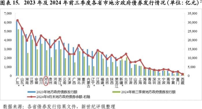 2023年以来,河北省地方政府债券发行规模持续增加,发行债券仍以新增债券为主。2023年,河北省发行地方政府债券4201.70亿元,同比增长17.4%,发行规模位列36个已发债省市降序第7位,其中新增债券和再融资债券分别为2543.00亿元和1658.70亿元。2024年前三季度,河北省发行地方政府债券2879.85亿元,发行规模位列36个已发债省市降序第8位。截至2024年9月末,河北省地方政府债券余额为2.02万亿元,位列36个已发债省市降序第6位。
