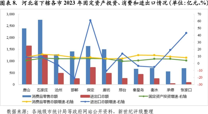 消费方面,2023年河北省各地市消费增速均较上年大幅提升,以石家庄和秦皇岛提升幅度居前,同时两市消费增速也居全省前两位,2023年石家庄和秦皇岛社会消费品零售总额同比分别增长12.9%和11.7%,增速较上年分别上升11.1个百分点和10.9个百分点。除石家庄和秦皇岛外,2023年消费增速超过10%的地市还包括沧州和衡水,社会消费品零售总额同比均增长11.6%。而廊坊和邢台消费增速居全省末两位,2023年社会消费品零售总额同比分别增长6.7%和6.8%,增速较上年分别上升6.2个百分点和6.6个百分点。除上述地市外,其余地市2023年消费增速区间为8.0%-9.6%。从消费规模来看,2023年石家庄和唐山社会消费品零售总额分别为2751.20亿元和2385.30亿元,消费规模仍稳居全省前两位;而经济总量居全省后四位的秦皇岛、衡水、承德和张家口消费规模也居全省后四位,2023年社会消费品零售总额均不超过700亿元;此外,相较于经济总量排序,沧州的消费规模排序相对较低,2023年沧州社会消费品零售总额为1276.40亿元,居全省降序第6位。进出口方面,2023年河北省各地市进出口表现差异较大,多数地市进出口总额实现增长,以保定增速最高,为61.2%;进出口总额下降的地市中,除邯郸进出口总额同比下降21.3%外,其余地市降幅均不超过15%。从规模来看,唐山和石家庄进出口总额仍居全省前两位,且显著高于其余地市,2023年两市进出口总额分别为1637.10亿元和1237.10亿元;保定2023年进出口总额大幅增长至714.10亿元,进出口规模排序由上年的全省第6位跃升至第3位,且显著高于排名第四的廊坊,廊坊2023年进出口总额为470.00亿元;张家口和承德2023年进出口总额仍均不到百亿元,分别为78.40亿元和26.30亿元,居全省末两位。