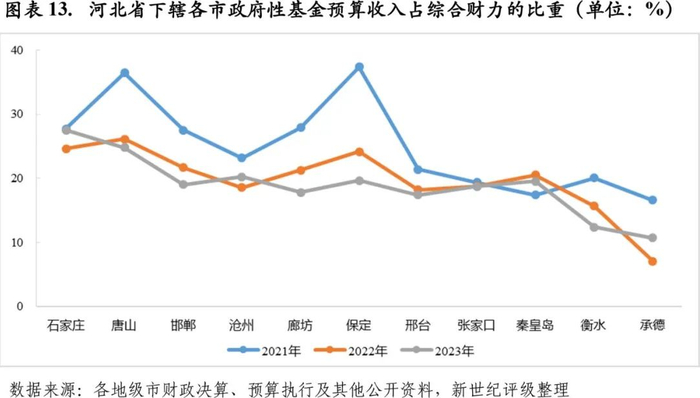 2023年虽然多数地市的政府性基金收入实现恢复性增长,但由于基金收入规模仍处于相对低位,加之一般公共预算收入和上级补助收入增幅相对较大,河北省多数地市政府性基金收入对地方综合财力的贡献率进一步降低。具体来看,承德、石家庄和沧州2023年因政府性基金预算收入增速相对较高,政府性基金预算收入占地方综合财力的比重较上年有所上升,分别上升3.61个百分点、2.92个百分点和1.67个百分点。其中,石家庄基金收入占比升至27.52%,成为全省政府性基金预算收入占比最高的地市;沧州基金收入占比为20.24%,居全省第三位;而承德基金收入占比仍居全省末位,仅为10.68%。除上述三市外,河北省其余地市2023年政府性基金预算收入占地方综合财力的比重均进一步降低,其中唐山和衡水2023年政府性基金预算收入占比分别为24.80%和12.36%,分别居全省第二位和倒数第二位,其余地市基金收入占比区间为17%-20%。