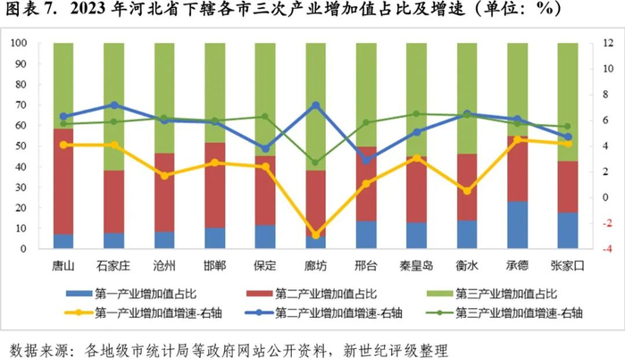 从三次产业增速来看,2023年除石家庄外,河北省其余地市第三产业增加值增速较上年均有所加快,且多数地市第三产业增加值增速快于第二产业。石家庄2023年第三产业增加值增速有所放缓,而第二产业增加值增速有所加快,是全省第二产业增加值增速最高的地市之一,2023年石家庄第一、第二和第三产业增加值分别增长4.1%、7.2%和5.9%,增速较上年分别下降1.1个百分点、上升1.8个百分点和下降1.1个百分点。2023年全省另一个第二产业增加值增速为7.2%的地市为廊坊,但廊坊近两年第三产业增加值增速均居全省末位,服务业发展活力不足,同时2023年廊坊第一产业增加值出现负增长。2023年廊坊第一、第二和第三产业增加值增速分别为-2.9%、7.2%和2.7%,较上年分别下降4.5个百分点、上升4.0个百分点和上升1.2个百分点。从产业结构来看,唐山仍是河北省唯一以工业经济为主导的地市,2023年三次产业结构为7.2:51.0:41.8;邯郸二、三产业占比相对均衡,是全省除唐山外,第二产业增加值占比超过40%的地市,2023年邯郸三次产业结构为10.3:41.2:48.5;其余地市经济结构则均以第三产业为主,其中,石家庄和廊坊虽然2023年第二产业增加值增速在全省最高,但两市是全省唯二第三产业增加值占比超过60%的地市,2023年石家庄和廊坊三次产业结构分别为7.7:30.6:61.7和6.0:32.0:62.0,经济结构均以第三产业为绝对主导。
