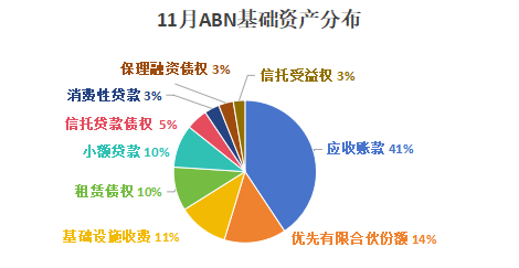 基础资产类型以应收账款为主,该类型29只产品共计发行251.05亿元,11月ABN发行中占比达41%,位居第一。优先有限合伙份额、基础设施收费、租赁债权、小额贷款发行占比均超10%。