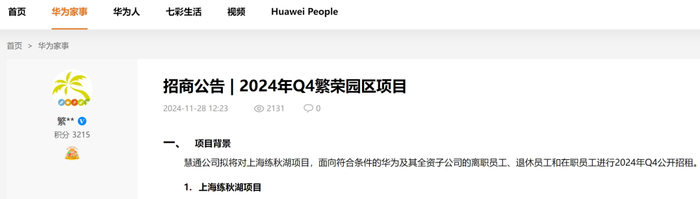 公告称,此项目面向符合条件的华为及其全资子公司的离职员工、退休员工和在职员工,进行2024年Q4公开招租。