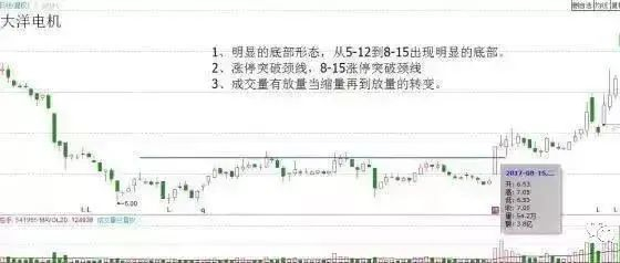 2. 涨停前有明显的底部形态,例如:头肩底形态、双底形态、三重底形态。