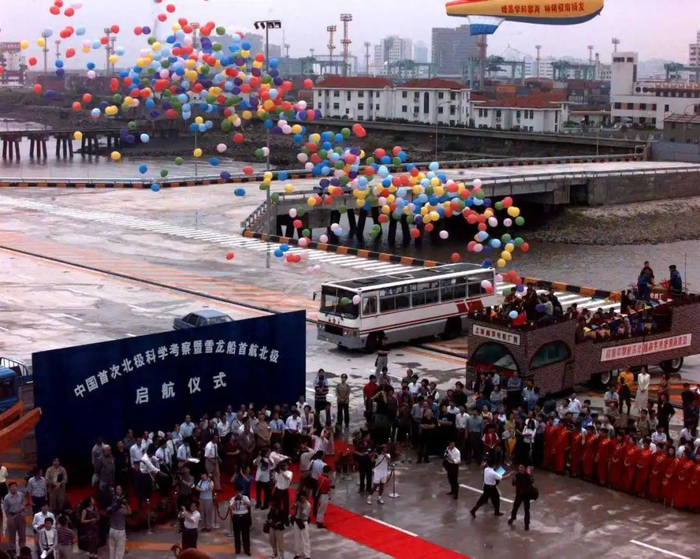 梅雨期间的上海,难得一个晴天。1999年7月1日10时,上海浦东外高桥码头。我国极地考察船“雪龙”号载着来自全国各地的66名科学考察人员和13家新闻单位的20名记者鸣笛起航,开启了中国首次北极科学考察。