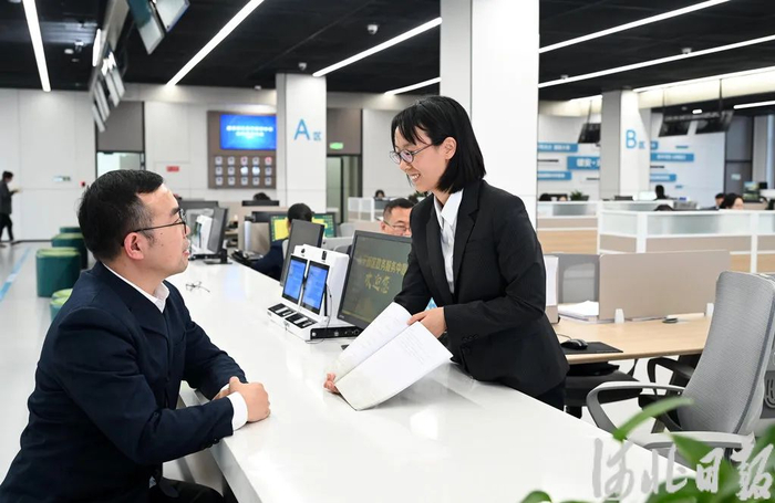 11月14日,雄安新区政务服务中心投资建设项目服务区综合受理窗口,雄安新区建设和交通管理局工作人员为办事群众提供咨询服务。河北日报记者刘光昱摄
