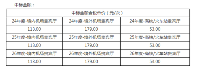 10月29日,光大银行公布了结果,最终中标人为北京悦途出行科技(集团)股份有限公司,具体中标价境内机场贵宾厅为113元,境外机场贵宾厅为179元,高铁/火车站贵宾厅为53元,期限为2024年度至2026年度。