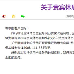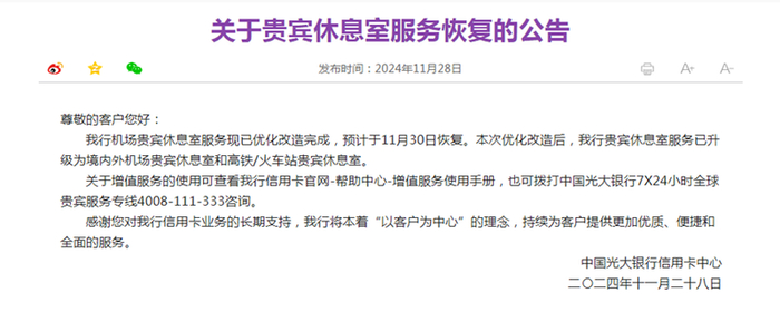 11月28日,光大信用卡发布关于贵宾休息室服务恢复的公告,我行机场贵宾休息室服务现已优化改造完成,预计于11月30日恢复。本次优化改造后,我行贵宾休息室服务已升级为境内外机场贵宾休息室和高铁/火车站贵宾休息室。