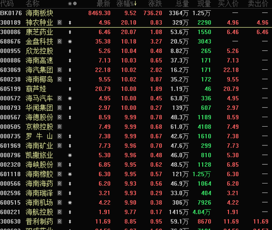 包括欣龙控股、海南高速、海汽集团、华闻集团、罗牛山、海峡股份、海南瑞泽、海航控股等20余股集体涨停。