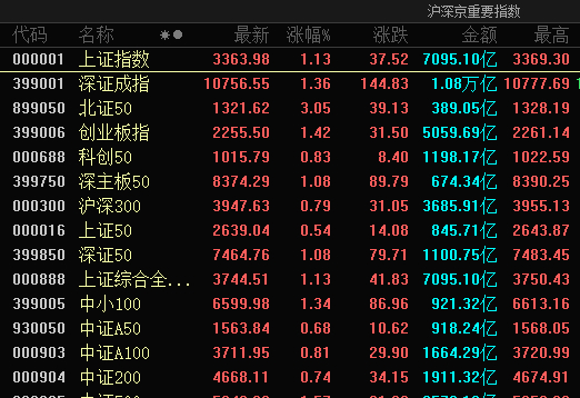 A股主要指数今日延续上周五涨势,三大指数均涨超1%;截至收盘,沪指涨1.13%报3363点,深证成指涨1.36%,创业板指涨1.42%。全天成交1.83万亿元,较前一交易日放量790亿元,全市场超4600股上涨。