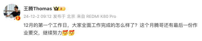 如上图所见,小米中国区市场部副总经理、REDMI品牌总经理王腾在微博暗示本月还有新品,预计就是指REDMI Turbo 4了。