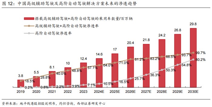 高阶智驾迎来渗透拐点。根据灼炽咨询的资料,2023年中国新增乘用车销量为2,170万辆,其中搭载L2级及以上辅助驾驶的车辆为1,240万辆,滲透率达到57.1%。而预计到2026年及2030年,中国智能汽车销量将分别达到2,040万及2,980万辆,滲透率分別为81.2%及99.7%。預計到2027年,中国乘用车部署的智驾解决方案众将有接近一半是高阶自动驾驶方案,而到2030年,此比例将进一步提高到80%以上。