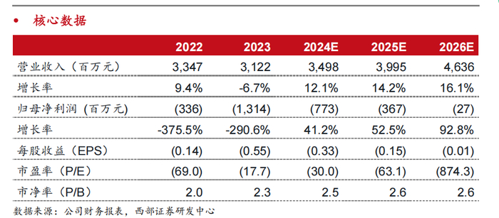 根据相关假设,综合各项业务,我们预计四维图新2024-2026年营收分别为34.98亿元、39.95亿元、46.36亿元,同比增加12.1%、14.2%、16.1%,归母公司净利润分别为-7.73亿元、-3.67亿元、-0.27亿元。