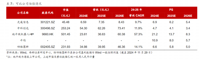 针对四维图新的估值,由于公司处于战略调整聚焦期,大额的研发投入尚未转化为营业收入,业绩端仍呈现亏损状态,我们以市销率PS对公司进行估值。选取同为智能驾驶赛道的光庭信息、中科创达及地平线作为可比公司。其中,光庭信息聚焦于智能网联车领域,布局智能座舱及智驾量产解决方案等业务。中科创达主营业务范围更广,但智能汽车业务线24H1营收占比超过45%,是最大的业务线,公司24年智能汽车的业务重点亦在智能座舱、智驾及整车操作系统领域。而地平线则专注智驾,是国内智驾软硬件一体解决方案领先的供应商。因此,我们认为上述公司在核心业务及商业模式(均以输出软硬一体解决方案为主)上与四维图新均是可比的。参考可比公司,我们给予公司2025年8倍PS的估值,目标市值319.6亿元,对应目标价13.46元,首次覆盖,给予“买入”评级。