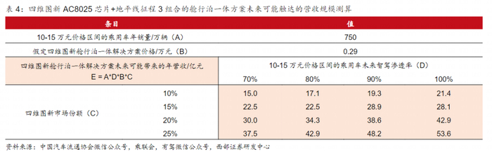 ·假定未来10-15万元区间的乘用车L2级别的智驾渗透率能够达到70%以上,而四维图新的产品方案凭借性价比优势能够收获10%以上的份额。