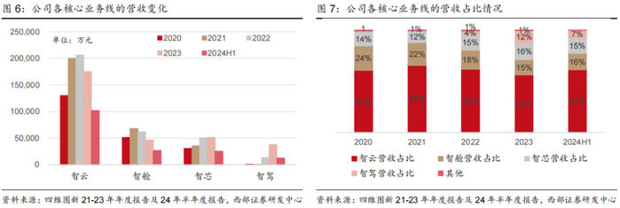 当前智驾产品的营收占比低,但未来营收结构可能随公司资源向智驾业务倾斜而逐步发生变化。从营收结构上看,涵盖公司地图导航传统产品线的智云业务仍贡献公司超过一半的营收,23年占比达到56%。智舱及智芯业务23年营收占比相当,分别为15%及16%。智驾业务在核心业务线中,营收占比最低。但自22年起,四维图新的智能驾驶软硬一体产品开启量产订单的签订并陆续出货,收入规模从由21年的不足千万元迅速增加至23年的3.76亿元。智驾作为公司未来的业务主线,我们预计随着公司低中高阶产品矩阵的完善以及量产交付,未来其营收占比有望持续提升。