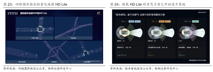 · 搭载HD Lite的智驾方案已开始逐步落地。在四维图新2024年用户大会上,公司发布了与轻舟智航联合打造的“基于征程®6M的高性价比城市NOA”方案。其中采用了轻舟智航的全栈高阶智驾算法和四维图新轻量化地图HD Lite及智驾域控。面对城市道路,HD Lite帮助智能驾驶车辆实现全域车道级路径规划及各种复杂场景的从容应对。