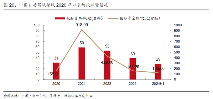 自动驾驶领域的投融资高峰期已过。根据中商产业研究院的统计数据,中国自动驾驶领域的投融资事件和总规模在21年达到顶峰,之后快速下降。2024年上半年,自动驾驶行业共29起投资事件,金额达125.66亿元,相较去年同期均有较大幅度的提升。我们判断,今年可能受到诸如主机厂和Tier 1转向端到端技术架构开始落地城市NOA,百度萝卜快跑的运营,特斯拉发布无人驾驶出租车Cybercab等一系列事件的催化,融资环境有一定的边际好转,但总体相较于21年,规模上仍然有不小的距离。