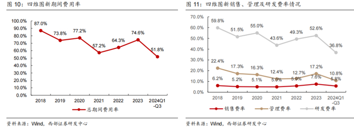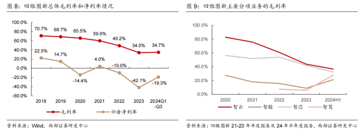 净利润侧,公司仍处于亏损状态,尤其2023年亏损有较大幅度的扩大。24年前三季度公司归母净利润为-4.87亿元,与2023年同期基本持平。我们认为,过往持续的亏损的主要原因在于公司在研发等费用端保持投入,而短期营收端暂未显著同步增加。同时,由于业务结构的变化,公司的整体毛利率水平亦在下滑,进而进一步影响了净利润端的表现。