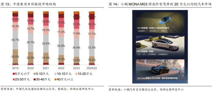 科技平权,高阶智驾开始向10-20万元级车型下沉渗透。由于感知硬件端的高成本,高阶智驾往往集中于20万元甚至30万元以上级别的车型。但最近一年来,主机厂正试图将高阶智驾带入更下沉的市场。我们认为其中最重要的原因在于,10-20万元的车型依旧是当前最为主导的汽车消费市场,占据超过50%的份额。消费者对于汽车智能化的认知不断提升,将带动对于大众市场的车型智驾需求,未来智驾可能也将在10-20万元级别市场成为影响用户购车意愿的重要考量因素。主机厂即开始布局,以小鹏MONA M03为例,作为一款顶配15万元的车型,它使用纯视觉方案,依靠20+智能感知硬件,支持高速领航辅助,并且未来可通过OTA升级实现城区辅助驾驶。