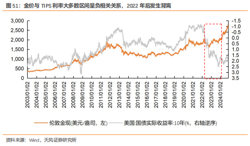 黄金抗通胀属性决定其定价底层逻辑是实际利率框架。实际利率=名义利率-通胀预期,实际利率可被视为持有黄金的机会成本,实际利率越高,持有黄金的机会成本越高,因此实际利率与黄金价格在历史上呈现出较为显性的负相关关系。十年期美债收益率被金融市场视为无风险利率的锚,因此剔除通胀的美国十年期TIPS利率可被视为实际利率的代理指标。