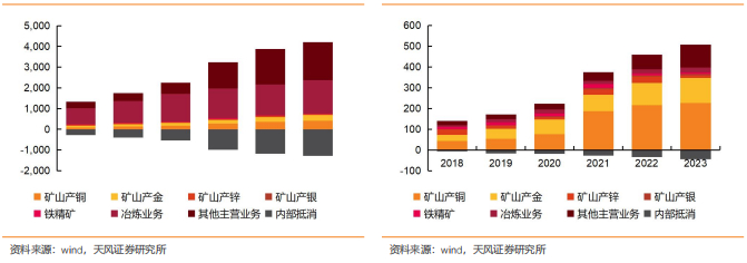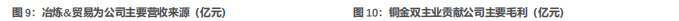 铜金双主业贡献公司主要利润。营收端,冶炼业务(含精炼)与贸易贡献公司主要营收,2023年分别贡献营收1613.8、1266.2亿元,营收占比分别为55.0%、43.2%,矿产铜、矿产金营收占比分别为14.1%、9.2%。盈利端,矿产铜、矿产金业务是公司利润增长的主要驱动力,2023年分别贡献毛利226.1、122.1亿元,毛利占比分别为48.7%、26.3%,其他矿产品矿产锌、矿产银、铁精矿毛利占比分别为2.3%、1.6%、1.6%,24年前三季度,矿产铜、矿产金业务毛利占比分别提升至49.1%、31.0%。