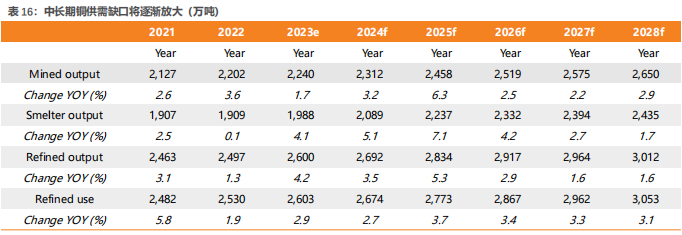 高铜价对资本开支刺激作用减弱,低资本开支限制中期铜矿供给。铜矿资本开支与铜价相关性强,2013年后铜价降低后资本开支低迷,使得后续铜矿产量增速下滑。2021年虽然铜价上涨,但铜矿资本开支水平较上轮高点仍有明显差异,我们认为主要是由于全球铜矿成本抬升,同样的价格对资本开支的刺激力度减弱,中长期看限制了铜矿未来供给。