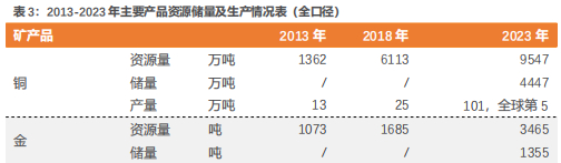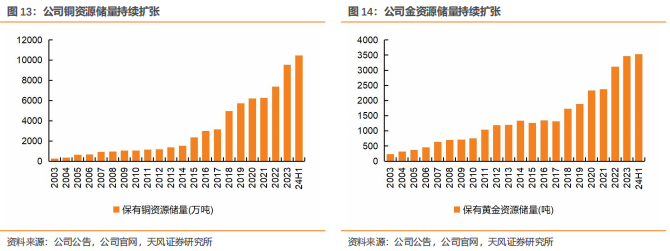 公司自主找矿勘探持续突破,二十年间铜金资源储量实现显著增长。回顾公司增储历程:铜资源储量从2003年的246万吨增长至2023年的9547万吨,其中2016年至2020年间增长尤为迅猛,铜资源量连续突破3000万吨、4000万吨、5000万吨大关,到2023年达到近10000万吨;公司黄金资源储量从2003年的235吨增长至2023年的3465吨,从2019年开始,黄金资源量呈跨越式增长。我们认为,铜、金资源量的持续扩张彰显公司成长性,资源优势已确立,凭借自主找矿勘探的竞争优势和管理层战略布局,未来公司资源量有望高位再进阶。