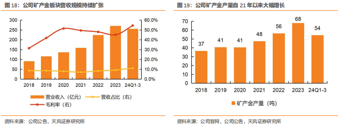2023年公司黄金资源量及产能位居主要上市矿企中国及亚洲第一、全球前十,同比增长超过20%,增速位居全球金企前列。2023年,公司矿山产金67.7吨,同比增长20.17%;冶炼加工及贸易金249.5吨,同比下降3.49%。根据中国黄金协会数据,2023年中国实现矿山产金297.3吨,公司矿山产金相当于中国总量的23%左右。24年前三季度,公司矿产金产量达54吨,接近22年全年矿产金产量。