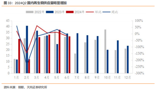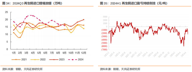 预计2024下半年再生铜供应增速将放缓。2024年上半年,铜精矿供应格局偏紧,再生铜进口量大幅增加对矿端原料形成有效补充。展望后市,随着“以旧换新”政策的逐步实施,我们预计下半年国内再生铜的供应量将会有所增加,而再生铜进口成本倒挂的情况仍未改善,预计下半年再生铜的进口增速将会放缓(自8月以来已开始兑现)。