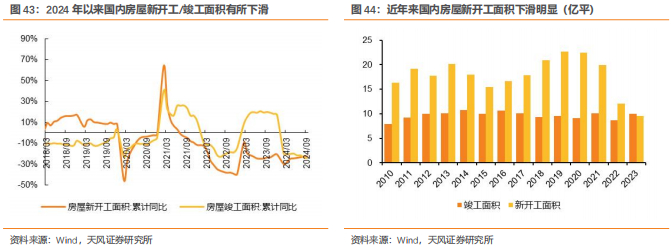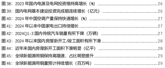 地产疲弱拖累建筑用铜,利好政策下短期韧性仍存。建筑领域中铜消费以电线电缆为主体,占建筑用铜的70%以上。近年国内房屋新开工面积下滑,对建筑用铜造成一定拖累。2022年7月政治局会议将“保交楼”写入政治局会议文件,随后央行、住建部等部门出台多项措施,“保交楼”成为房地产行业出清过程中首要目标之一。2023年,国内竣工面积9.98亿平,同比+15.8%止跌回升。2024年前三季度,国内房屋新开工/竣工面积同比均有所下滑。中长期看,铜消费面临新旧动能转换,预计建筑用铜量仍将下行,短期看,在“保交楼”等稳楼市政策的推动下,预计建筑用铜将存在一定支撑。