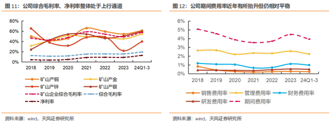 综合毛利率、净利率整体处于上行通道,费用管控能力优异。公司矿山业务保持高盈利水平,支撑公司综合毛利率、净利率提升,2023年公司综合毛利率、净利率分别为15.8%、9.1%,矿产铜/矿产金/矿产锌/矿产银毛利率分别为54.5%/45.1%/21.8%/50.8%,矿山企业综合毛利率为49.1%。24年前三季度,得益于金属价格上行和降本增效,公司利润率持续提升,综合毛利率、净利率分别提升至19.5%、12.9%,同比+4.4pcts/+4.0pcts,矿产铜/矿产金/矿产锌/矿产银毛利率分别提升至61.2%/54.5%/39.9%/59.7%,矿山企业综合毛利率提升至57.7%。费用率方面,2018-2021年,公司期间费用率持续下降,2022-2023年,由于新增并表企业增加销售、管理费用,同时融资规模增加和外币借款利率提高导致财务费用上升,公司期间费用率有所抬升,2023年期间费用率4.5%,同比+0.8pcts,24年前三季度精益管理驱动期间费用率回落至3.9%。