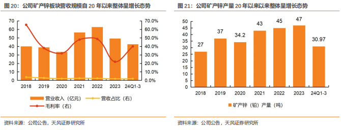 资源集约节约利用,低品位开发助力产量增长。紫金锌业乌拉根锌(铅)矿为中国境内特大型低品位锌(铅)矿山,公司通过实施资源集约节约利用,项目成为全球入选品位最低、国内产品产量最大的在产单体铅锌矿山。截至23年底,公司拥有资源量锌506万吨、铅86万吨;2023实现矿产锌14万吨、矿产铅2.5万吨;2024年计划矿产锌14万吨、铅2.4万吨。总体上锌铅产量呈现增长趋势。