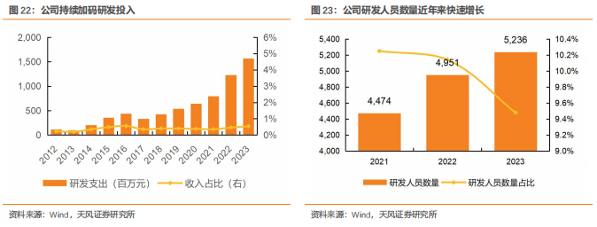 持续加码研发投入,研发人员数量占比行业领先。公司重视科研,近年来研发支出迅速增长,2018-2023年,研发支出从4.25亿元增至15.67亿元,5年间复合增速高达30%,尤其是2022年,研发支出同比增加55%。截至2023年底,公司研发人员数量达5236人,占比达9.5%,高于同行业可比公司(洛钼同期为7.8%),同时公司旗下拥有18家国家高新技术企业、109项国家级或省部级科技奖励、224项自主知识产权,科技成果亮眼。