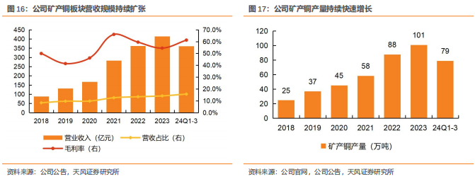 2023年公司矿产铜实现历史性重大突破,成为中国及亚洲唯一矿产铜产量破百万吨大关矿企,位居全球前五。2023年,公司矿山产铜100.7万吨,同比增长11.13%;冶炼产铜72.46万吨,同比增长4.88%;2024年前三季度,公司实现矿产铜79万吨,同比增长4.7%。根据中国有色金属工业协会数据,2023年中国实现矿山产铜161.9万吨,公司矿山产铜相当于中国总量的62%左右。营收方面,2023年公司矿产铜实现营收414.8亿元,营收占比14.1%;2024年前三季度矿产铜实现营收360.8亿元,营收占比15.7%。2023年矿产铜毛利率为54.5%,得益于铜价上行和降本增效,2024年前三季度矿产铜毛利率提升至61.2%。