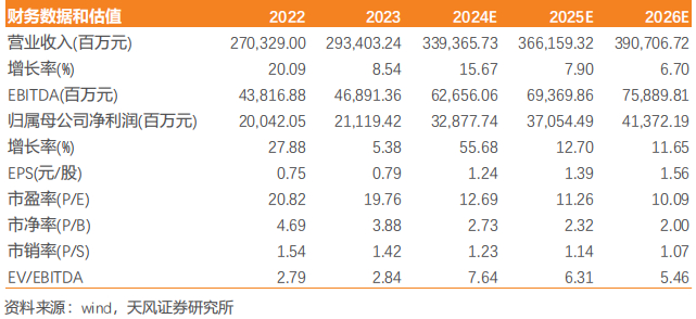 基于以上假设,内部抵消后,我们预计24-26年公司营收分别达3393.7/3661.6/3907.1亿元,同比+15.7%/7.9%/6.7%,毛利分别为633.1/728.2/803.6亿元,同比+36.5%/15.0%/10.3%,毛利率分比为18.7%/19.9%/20.6%。