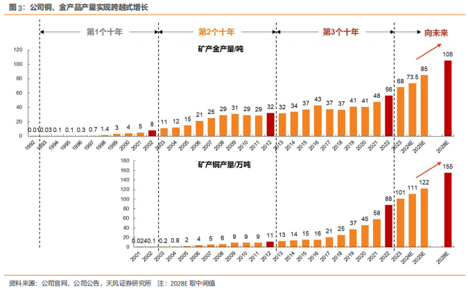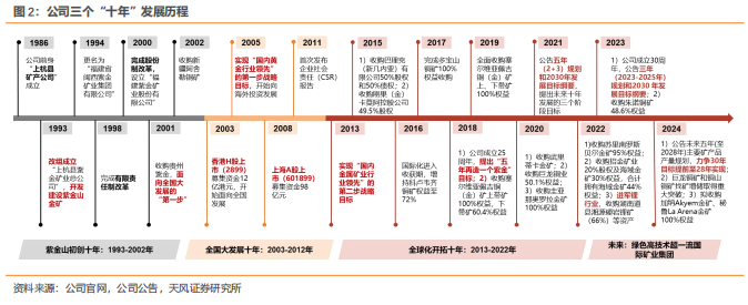 1993年,公司起步于紫金山金矿,经过30年三个阶段的跨越式发展,公司已由县属小企业蜕变成世界500强、全球知名的大型跨国矿业集团。第三个十年进行全球化开拓,公司实现资源及产能大幅增加,目前在国内17个省(区)和海外15个国家拥有重要矿业投资项目,已经成为中国铜、金、锌资源储量最大、产量最多、综合效益最好的金属矿业企业。24年5月16日的董事会上,公司已进一步细化公司未来五年主要矿产品产量规划指标,并提出力争将2030年主要经济指标提前2年(至2028年)实现,向超一流国际矿业集团的发展目标持续迈进。