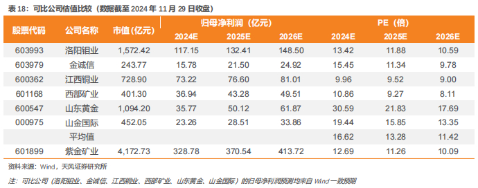 我们选取主营业务同为铜矿的洛阳钼业、金诚信、江西铜业、西部矿业及主营为金矿的山东黄金、山金国际作为可比公司,根据Wind一致预期,可比公司2025年平均PE为13.3x。我们预计24-26年紫金矿业实现归母净利润328.8/370.5/413.7亿元,对应2025年PE为11.3x,作为有色资源龙头,公司未来产量规划与成长路径明确,铜金产量稳步增长,锂、钼打造新增长极,参考可比公司估值,我们给予公司2025年PE 14x,对应市值5187.6亿元,对应目标股价19.5元/股,首次覆盖给予“买入”评级。