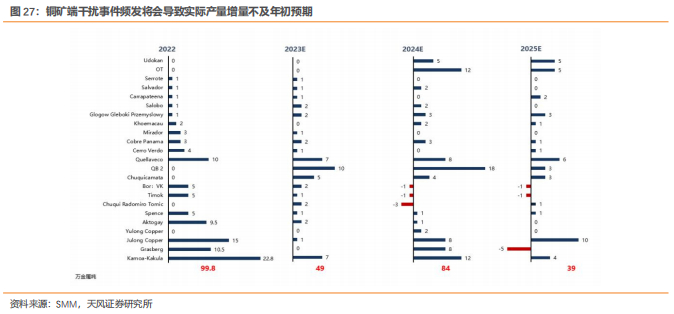 矿端干扰事件频发导致铜精矿产量增量受限。24年全球铜矿增量预计主要来自Udokan、OT 矿、泰克资源QB矿2期等项目,据SMM,矿企计划内的产量增量约84万吨。由于抗议和政治纷争问题,第一量子旗下的Cobre Panama铜矿自23年11月开始停产,英美资源也由于运营挫折将24年产量削减约20万吨,矿端干扰对全球铜矿增量造成影响。