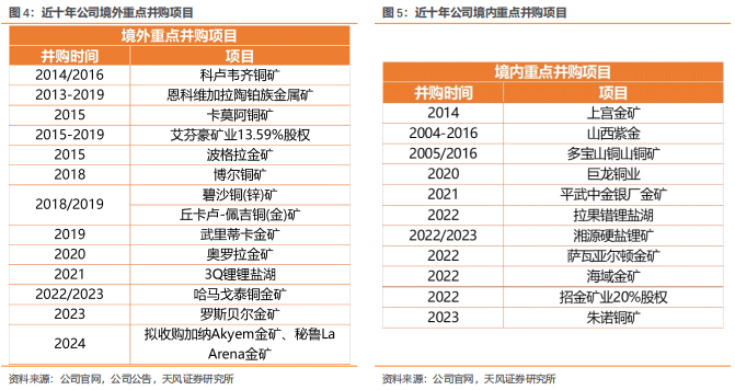 紫金矿业自2013年起积极响应“一带一路”政策,加速海外投资并购,持续实施低成本逆周期并购策略。2014年,收购刚果穆索诺伊矿业简易股份公司51%股份,成为其控股股东,之后从华友钴业收购21%股份,共计持有该公司72%的股权,成功进入非洲科卢韦齐铜矿项目。2015年,在铜价、金价低谷期,公司以低价策略大举收购,完成了波格拉金矿、卡莫阿铜矿收购,并参与了艾芬豪公司、恩科维铂业增发,完成了诺顿金田退市。2018年,收购塞尔维亚RTB Bor 铜矿63%股权。2019年,收购Nevsun 100%股权,旗下拥有塞尔维亚Timok铜金矿及非洲厄立特里亚在产矿山Bisha铜锌矿。2020年,收购武里蒂卡金矿、西藏巨龙铜业50.1%权益、圭亚那奥罗拉金矿100%权益。2021年,开始向能源金属进军,要约收购阿根廷3Q锂盐湖。2022年,收购西藏拉果错锂矿、Rosebel金矿、海域金矿30%权益、招金矿业20%股权等,矿产收购和股权交易超10宗,累计投资近350亿元。2023年完成苏里南罗斯贝尔金矿、蒙古哈马戈泰铜金矿交割,并完成朱诺铜矿48.59%权益并购。2024年拟收购加纳Akyem金矿、秘鲁La Arena金矿和二期项目100%权益。