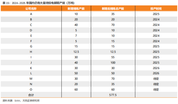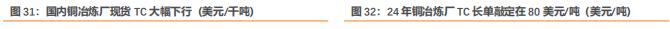 矿端紧张通过大幅下行的加工费传导至冶炼端。2024-2025年国内有大量冶炼产能待投,偏紧的矿端预期叠加冶炼产能的宽松带来TC/RC大幅下行。24年3月13日中国有色金属工业协会召开的铜冶炼企业座谈会中,与会企业就调整冶炼生产节奏达成一致,将压减生产负荷、新建产能推迟投运,此外国家也将提高新建铜冶炼项目准入门槛。冶炼端的收紧预计将对精炼铜产量形成制约。